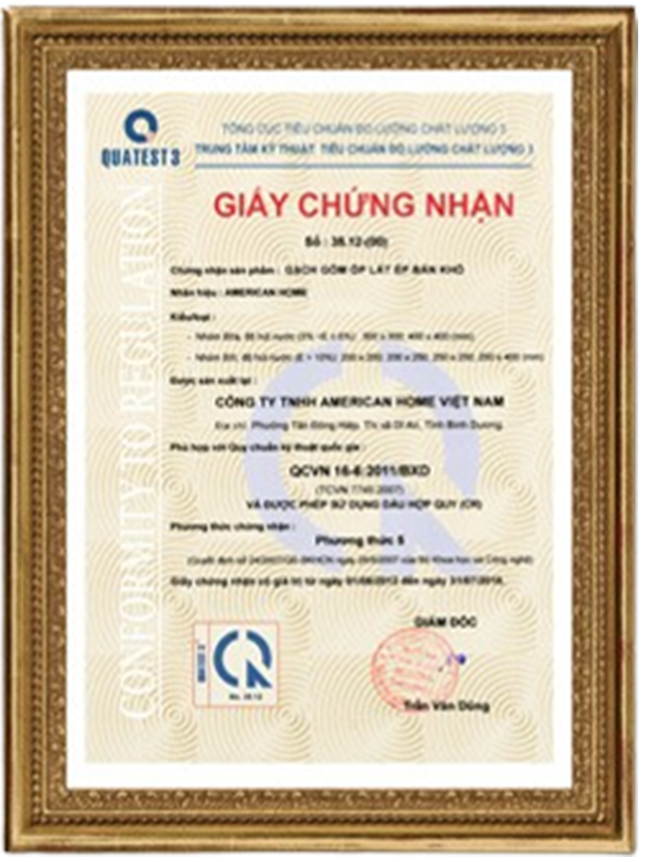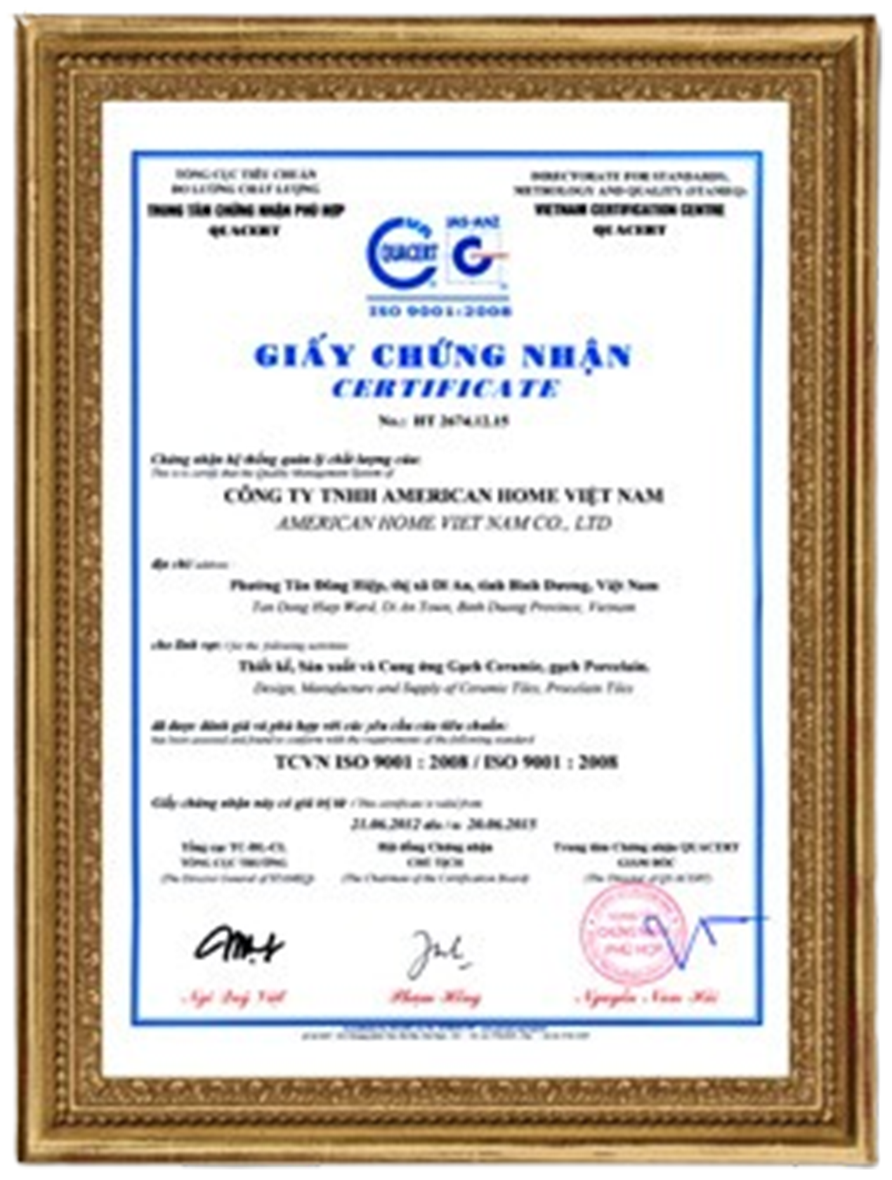 2012 – Ngày 21/6/2012, Tổng cục tiêu chuẩn đo lường chất lượng – Trung tâm Quacert chứng nhận Hệ thống quản lý chất lượng của American Home Việt Nam phù hợp với tiêu chuẩn TCVN ISO 9001:2008.