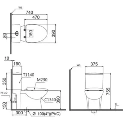 Bản vẽ bàn cầu Caesar CD1340 nắp rửa điện tử TAF400H