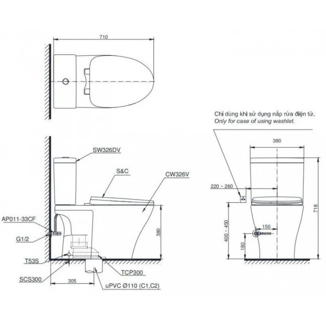 Bồn Cầu TOTO CS326DE2 2 Khối Nắp Cơ TCW07S