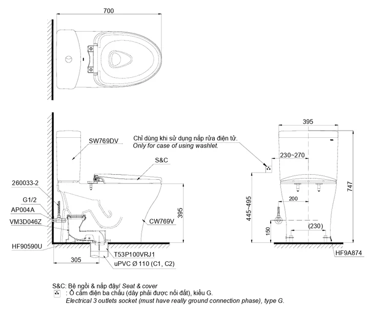 - Phù hợp lắp đặt với nắp rửa điện tử WASHLET (tùy chọn)