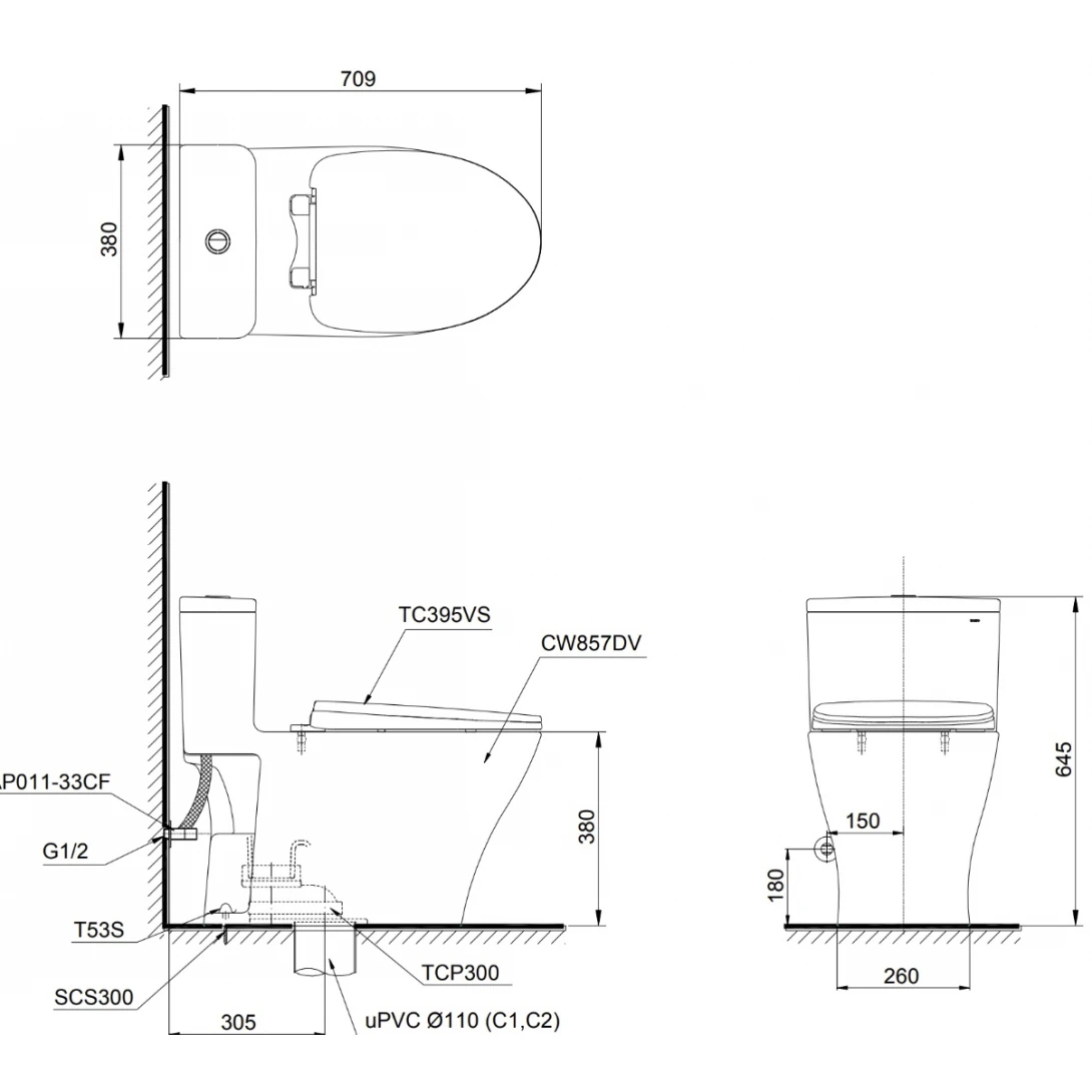 Bản vẽ kích thước xí bệt C857D TOTO nắp êm TC395VS