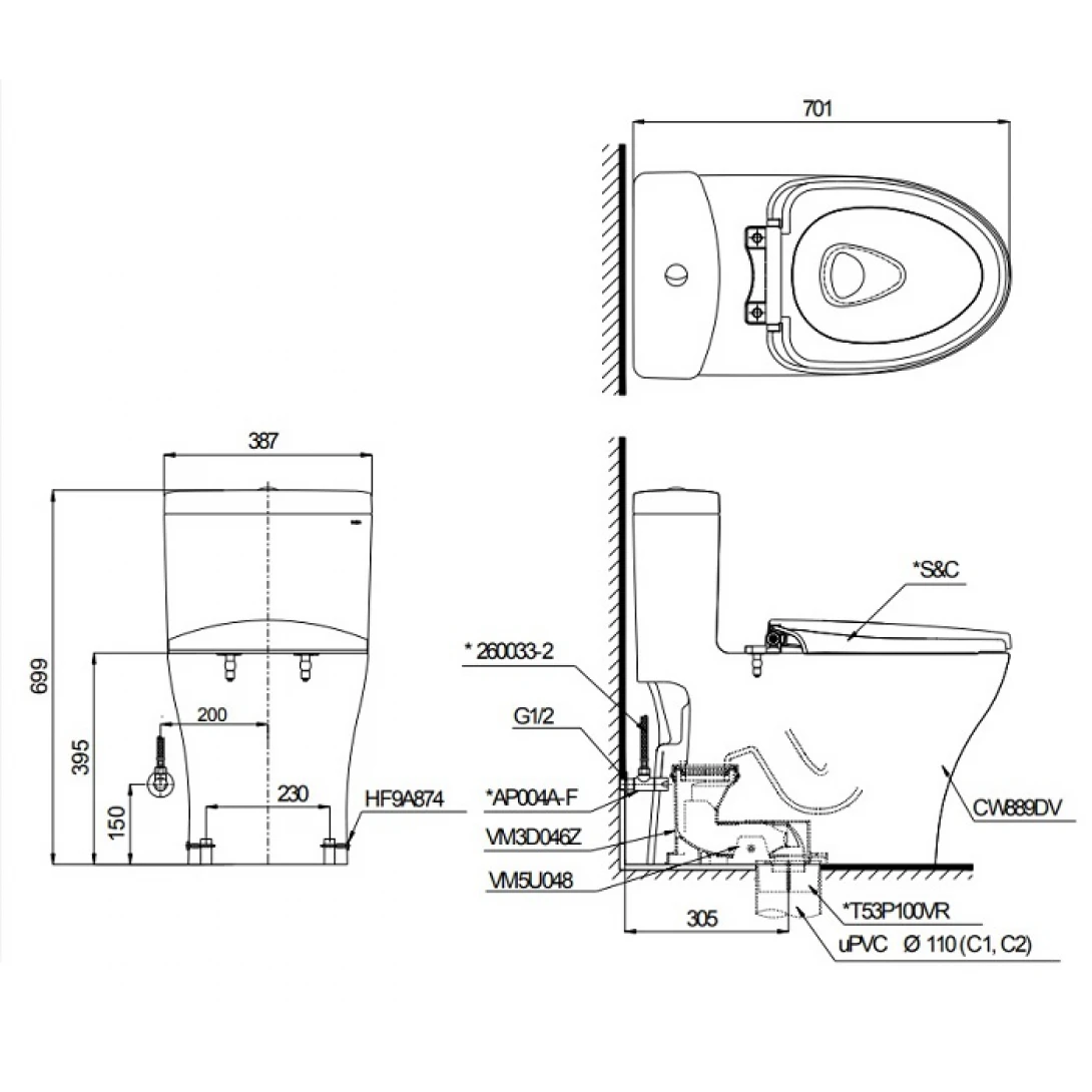 Bồn Cầu TOTO MS889DRT3 (MS889DT3) Một Khối Nắp TC385VS
