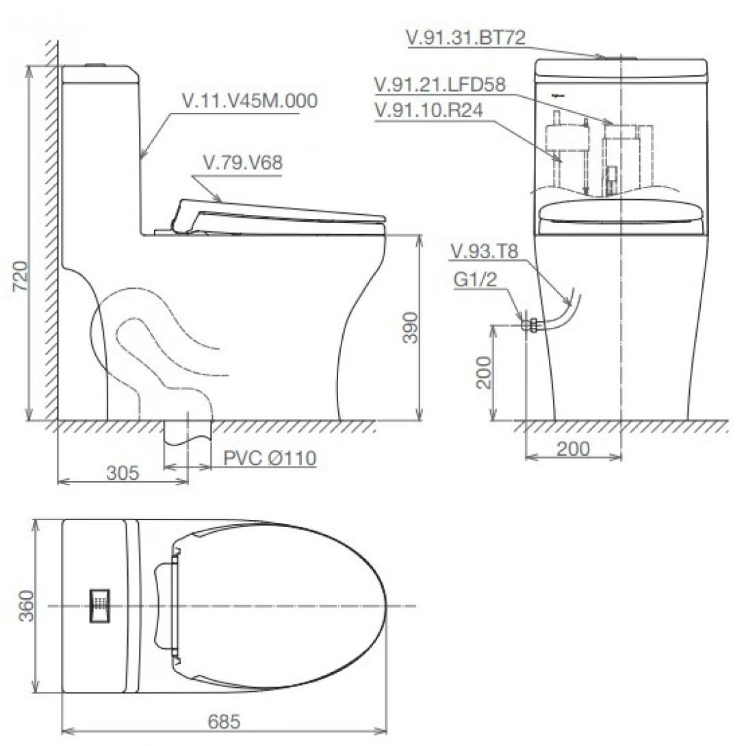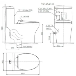 Bồn Cầu Viglacera V45M Nắp V687 Xả Xoáy + Vòi Xịt VG826