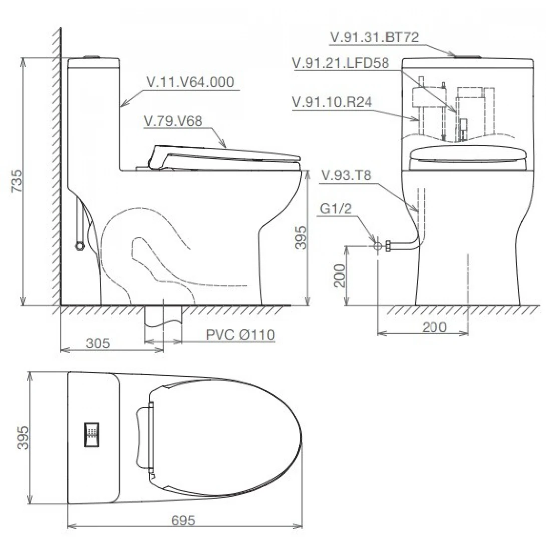 Bản vẽ bệ xí bệt Viglacera V64 1 khối